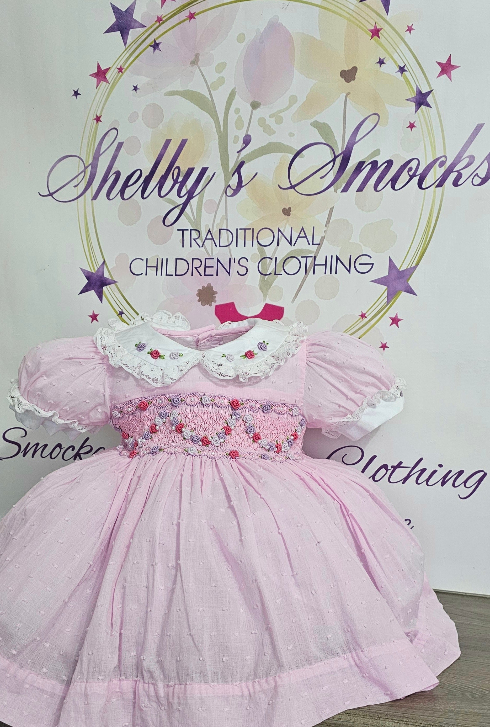 Candy pink swiss dot fabric dress, with shades of lilac and pink thick smocking with pearl beard detailing.